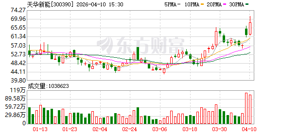 以预增幅度来看,天华新能的增长预期最为凌厉,随着2025年储能和动力电池的爆单,中游锂电材料商业迎来业绩的春天。4月8日盘后,氢氧化锂龙头天华新能发布2026年一季报业绩预告,报告期内归母净利润预计实现9亿元~10.5亿元,同比增长27517.53%~32120.45%,业绩预告披露后,公司股价持续上涨,4月10日盘中触及近三年新高71.18元/股(见图2)。