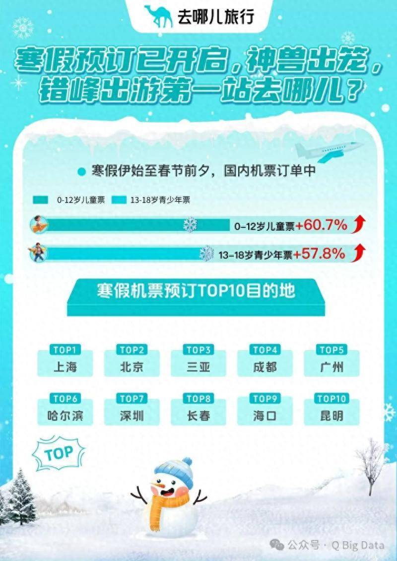 11月以来,各地陆续公布了寒假时间。据统计,今年东北、海南的中小学生,寒假时长都超过了40天。去哪儿旅行数据显示,2026年1月中旬寒假开启后至春节前夕,国内航线机票的支付均价比春节便宜三成。不少家庭选择避开春节高峰,把寒假前半段作为“亲子错峰出游”的最佳时机。这段时间,儿童、青少年的机票预订量显著增长,且增幅远超成人。其中,0-12岁儿童的机票预订量同比去年寒假增长60.7%,13-18岁青少年的机票预订同比涨了57.8%。期间,游客南下避寒的需求明显,国内机票的TOP10热门目的地包括上海、北京、三亚、成都、广州、哈尔滨、深圳、长春、海口、昆明。