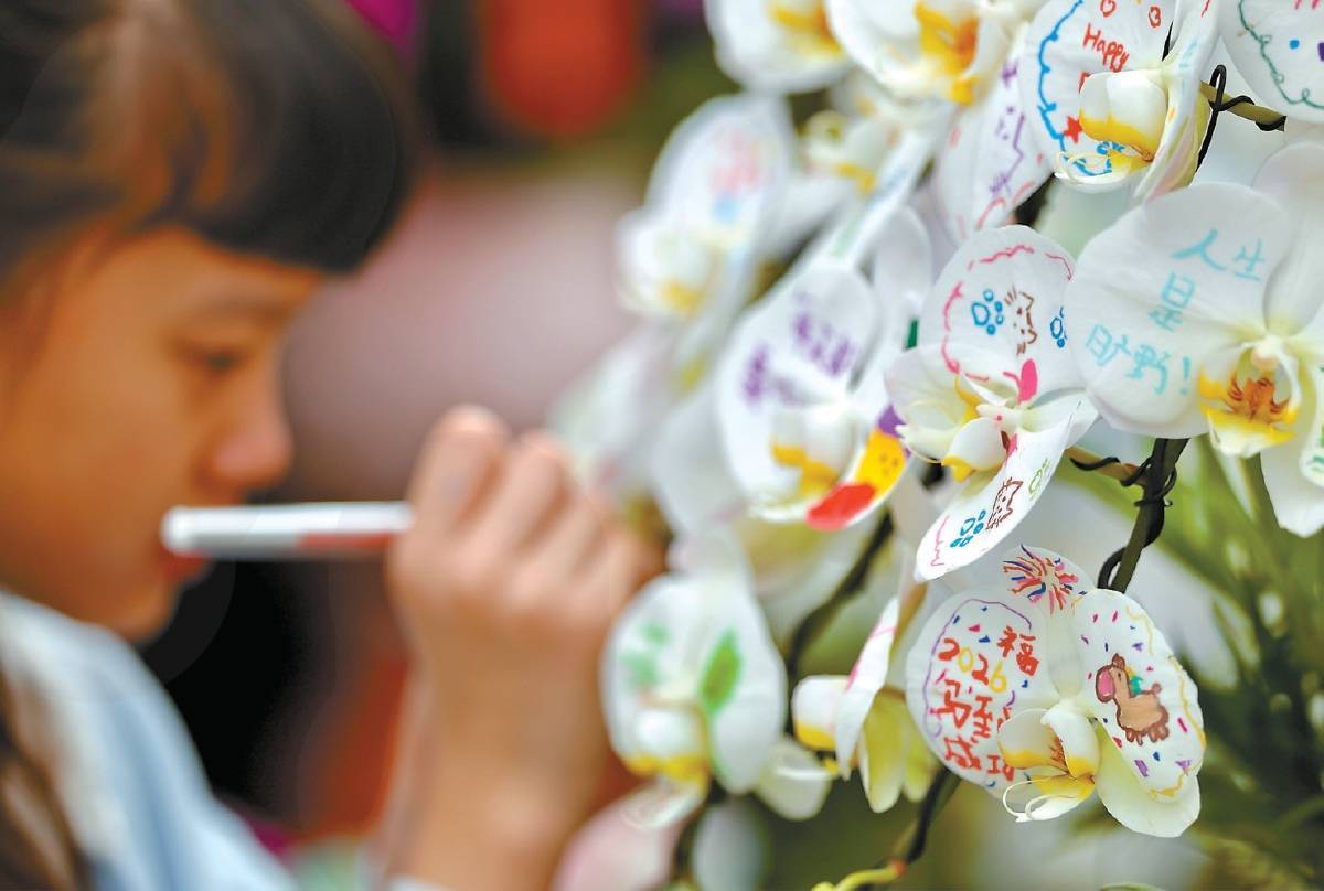 2月13日,北京黄土岗花卉市场里,来自福建漳州的女孩孙婧馨在自家销售的蝴蝶兰花瓣上画画,美好的心意、稚气的图案,让喜庆的年宵花多了一份童趣。 文并摄/本报记者 杨益